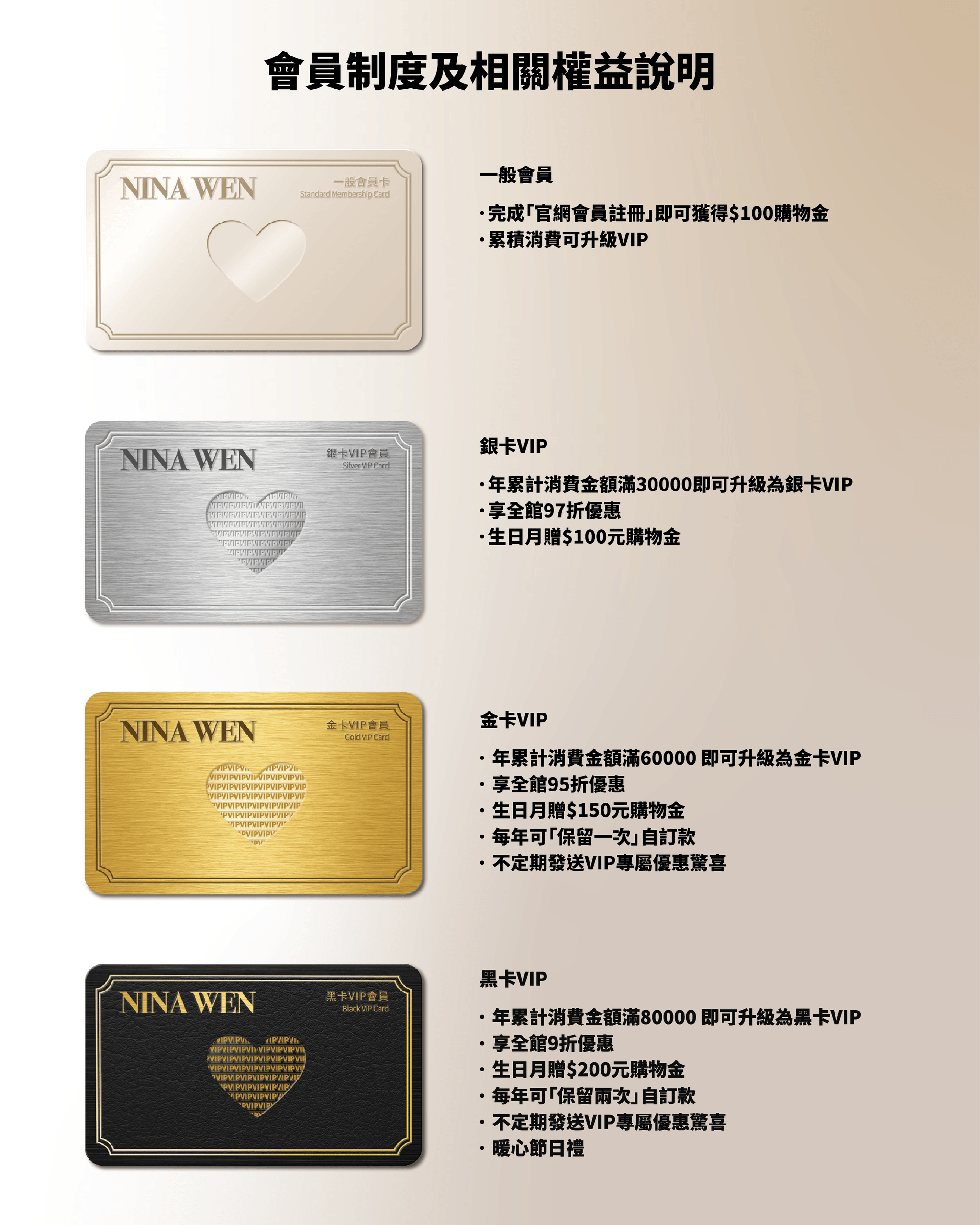 ・會員帳號密碼請勿公開於網路中共用,若有發現,NINAWEN有權刪除其會員資料與權限。