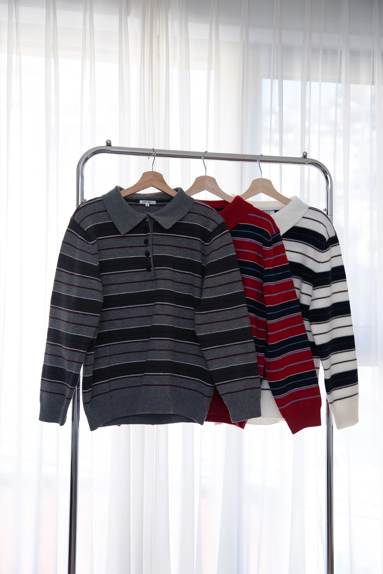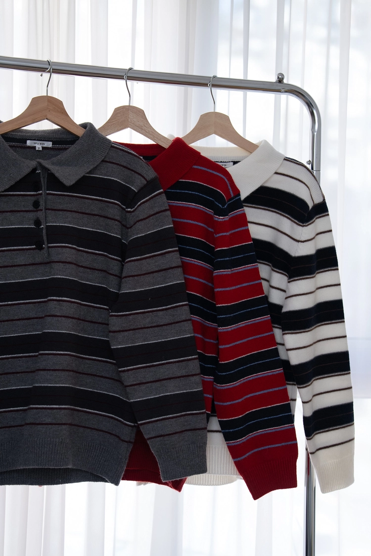 Polo領羊毛撞色條紋上衣