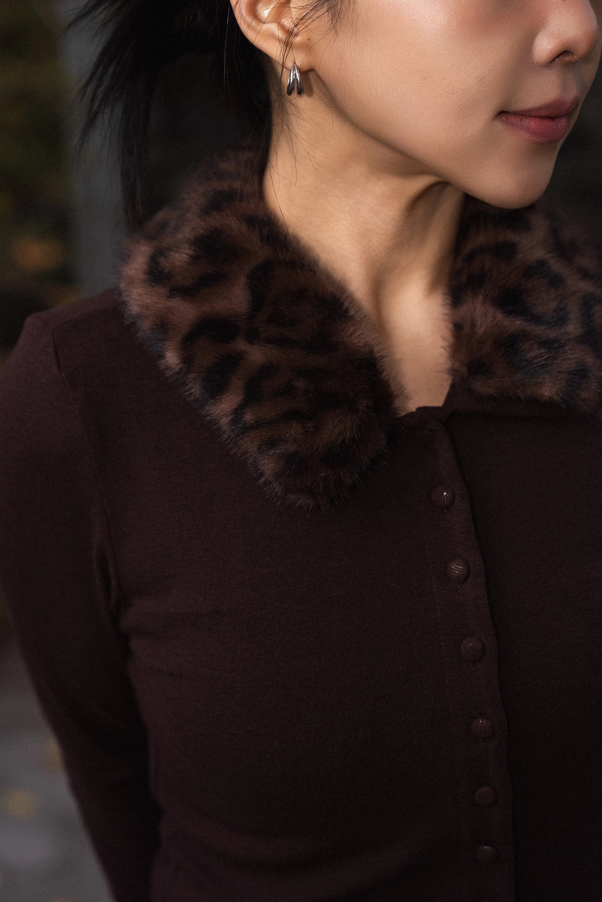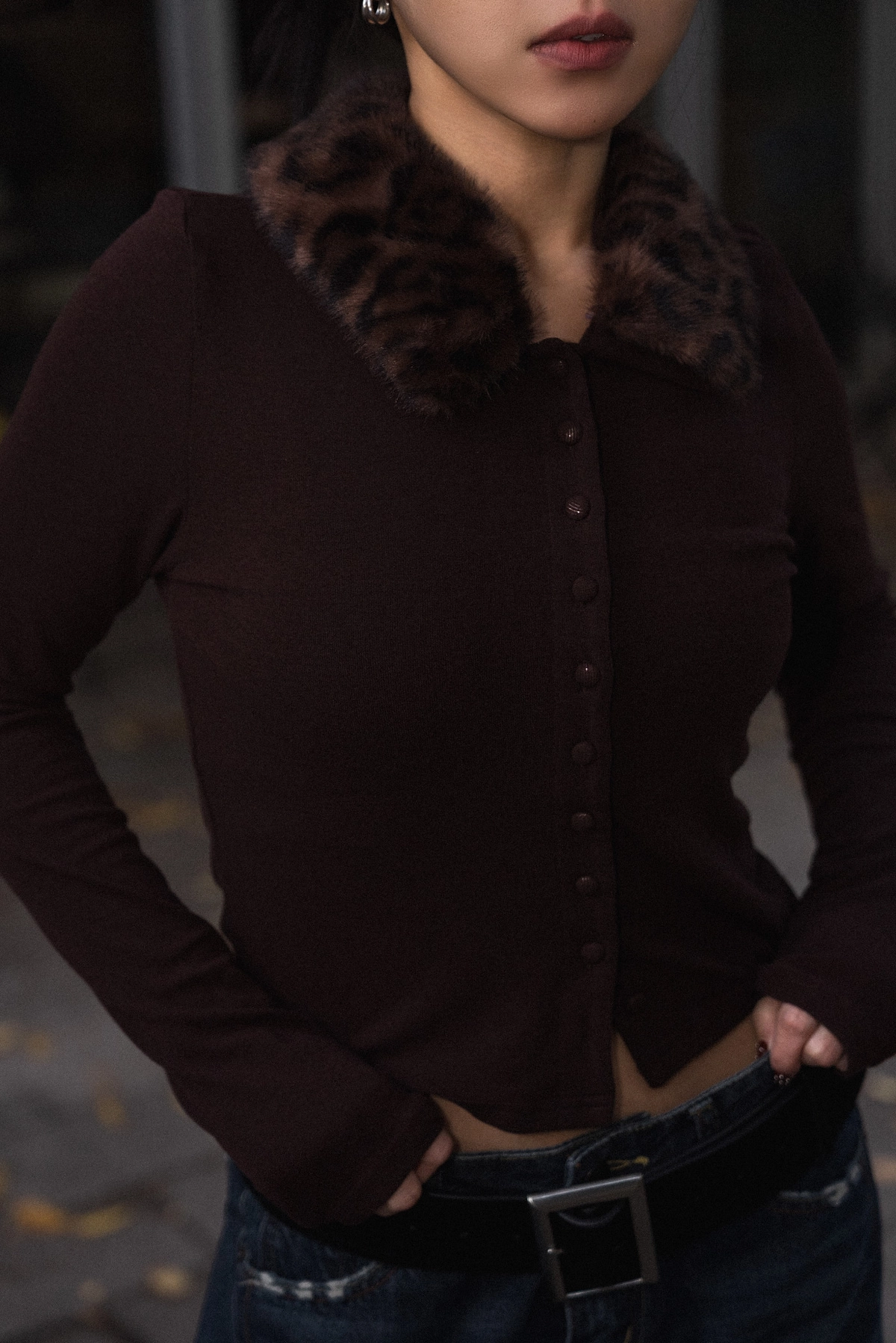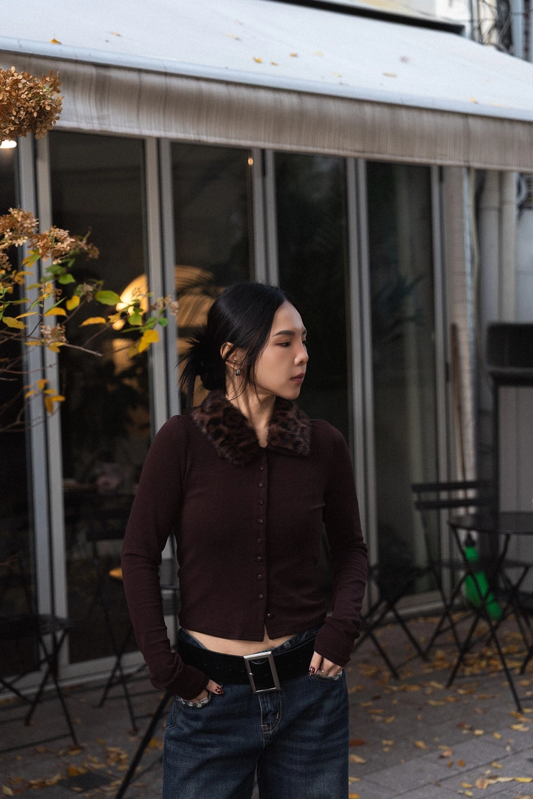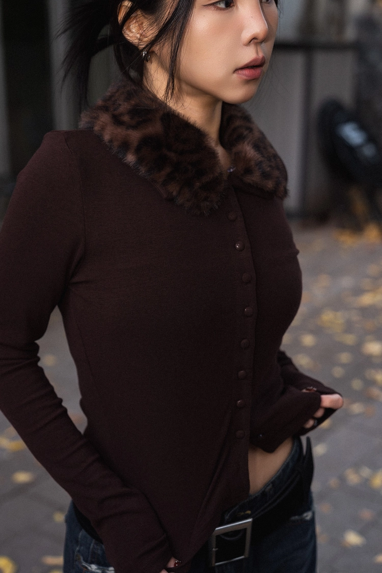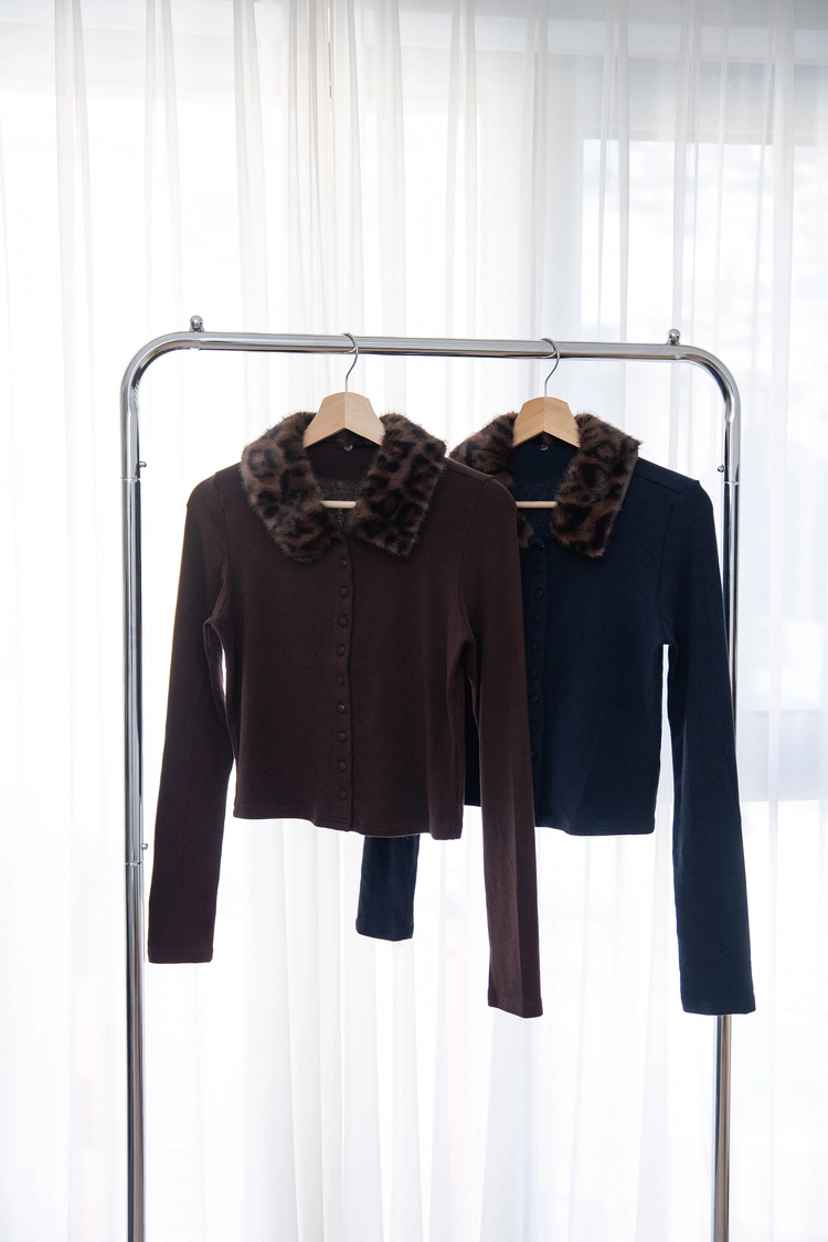 豹紋毛領開襟上衣